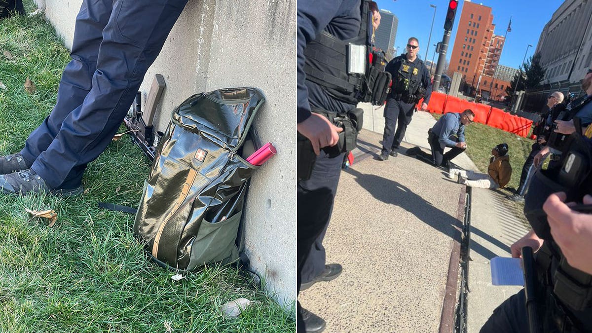 Tony Janssens shared photos of one of the Kansas City Chiefs parade suspects handcuffed on the sidewalk, with the alleged shooter’s backpack on the ground nearby. (Tony Janssens/X)
