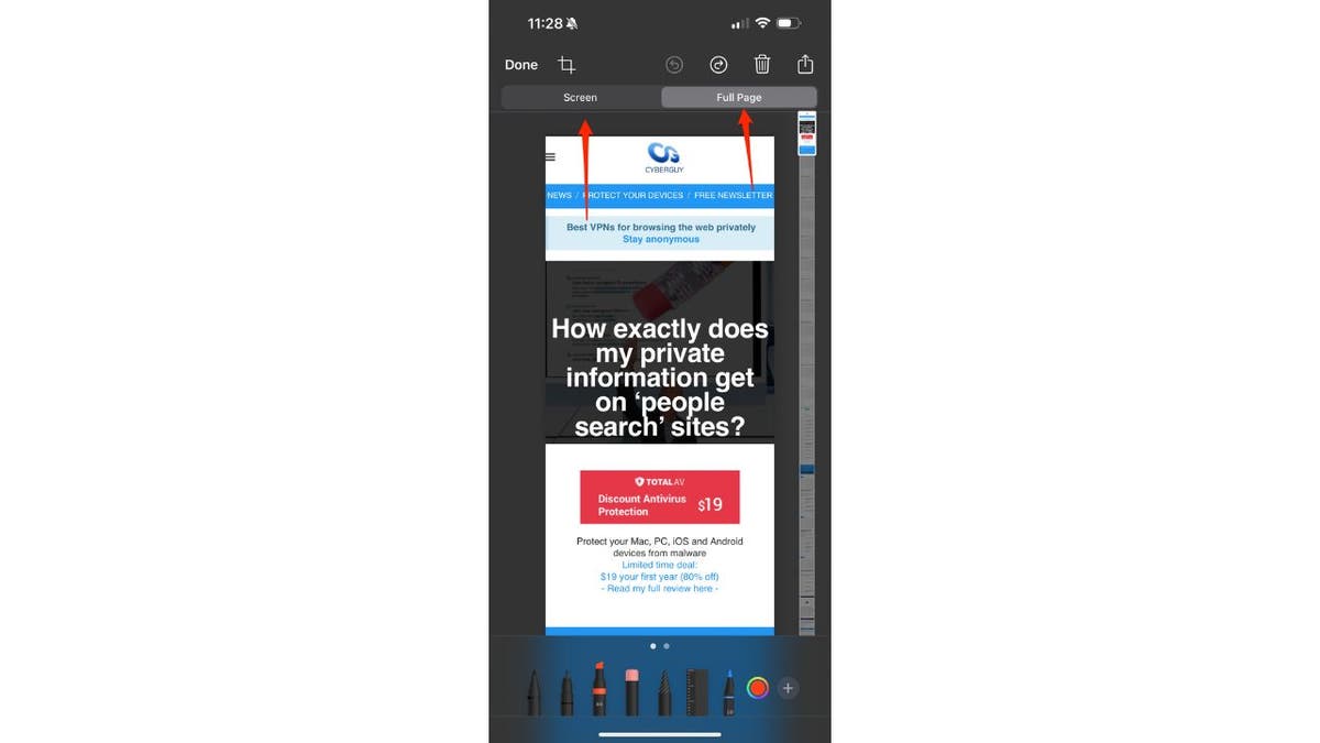 - Tap on the preview to open the screenshot editor. You will see two options at the top: Screen and Full Page.