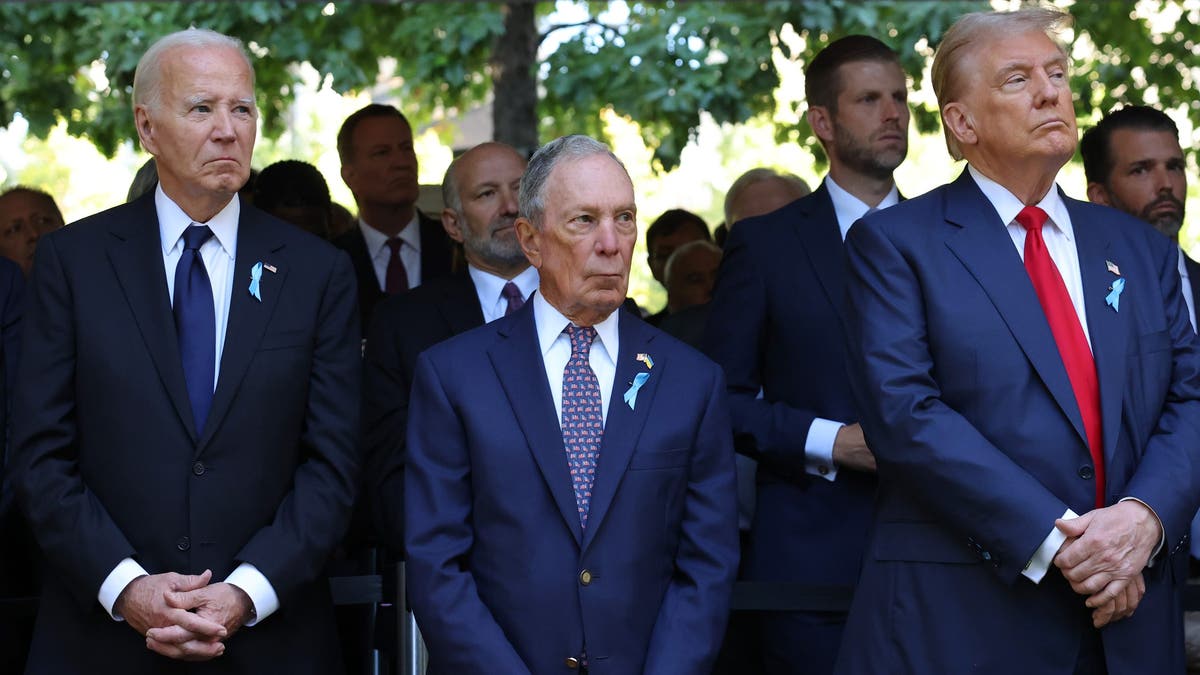U.S. President Joe Biden, former NYC Mayor Michael Bloomberg, and former U.S. President Donald Trump attend the annual 9/11 Commemoration Ceremony at the National 9/11 Memorial and Museum on Sept. 11, 2024, in New York City. (Michael M. Santiago/Getty Images)