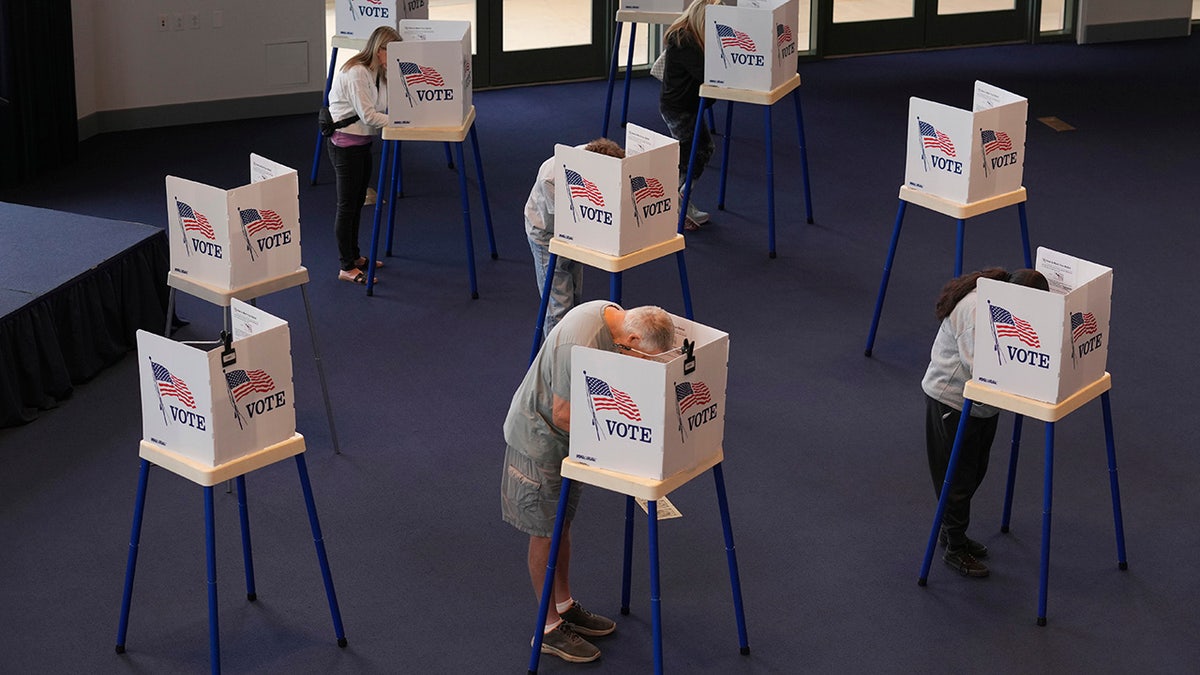 Voters work on their ballots at a polling place at the Ronald Reagan Presidential Library on Election Day, Tuesday, Nov. 5, 2024, in Simi Valley, Calif. (AP Photo/Chris Pizzello)
