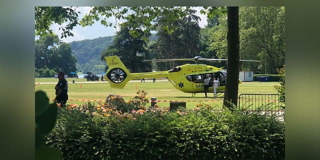 A medical helicopter is pictured after a knife attack in a park of Annecy, French Alps, Thursday, June 8, 2023. An attacker with a knife stabbed several young children and two adults, leaving some with life-threatening injuries, in a town in the Alps on Thursday before he was arrested, authorities said. (Florent Pecchio/L’Essor Savoyard via AP)