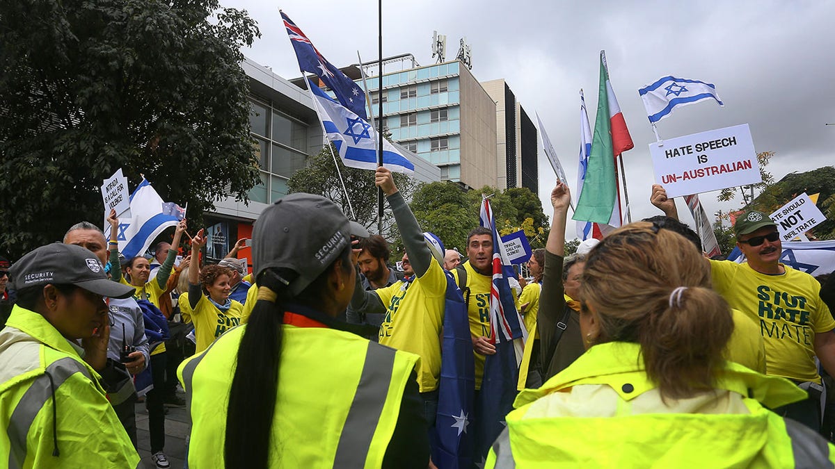 A line of security divides pro-Israeli protesters from reaching pro-Palestinian protesters during a rally at the University of Sydney on Friday, May 3. (Lisa Maree Williams/Getty Images)