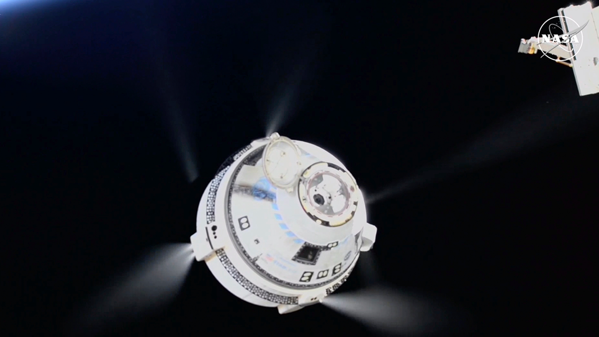 The unmanned Boeing Starliner capsule fires its thrusters as it pulls away from the International Space Station on Friday, Sept. 6, 2024. (NASA via AP)