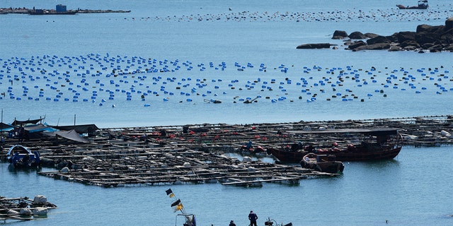 A boat moves through the water at the 68-nautical-mile scenic spot, the closest point in mainland China to the island of Taiwan, in Pingtan in southeastern China’s Fujian Province on Aug. 5, 2022. (AP Photo/Ng Han Guan)
