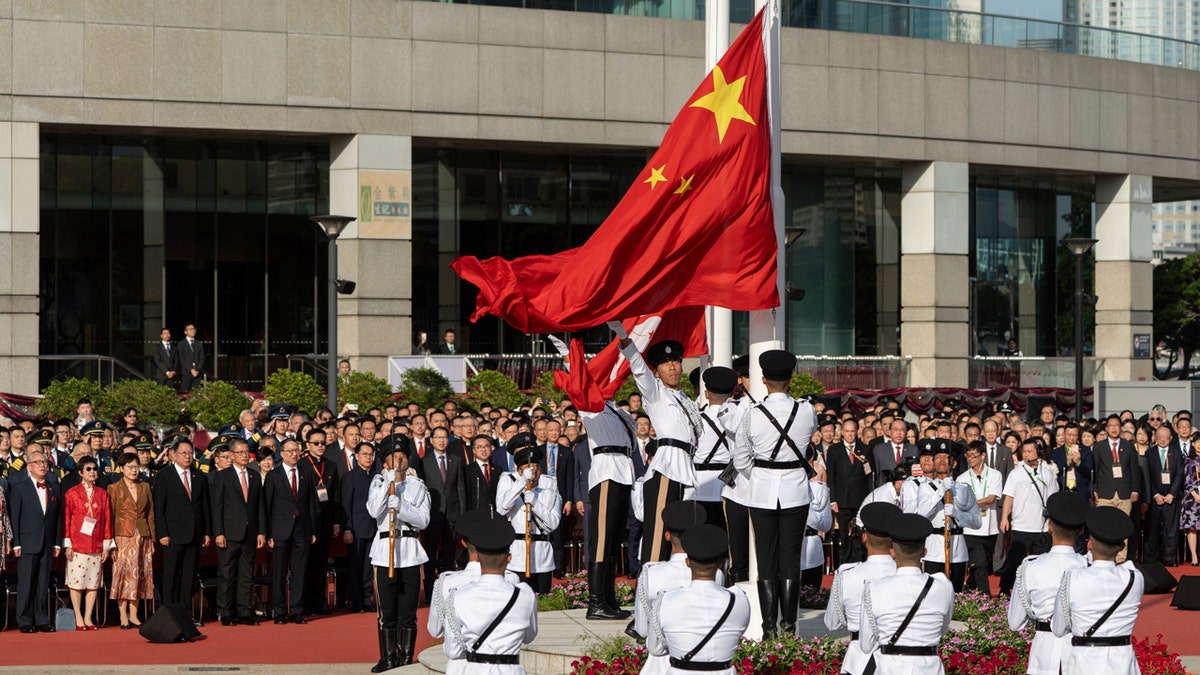 A Hong Kong police honor guard raises China and Hong Kong flags during a ceremony in celebration of the 75th National Day of the People’s Republic of China in Hong Kong Oct. 1, 2024. (AP Photo/Chan Long Hei)