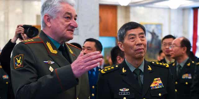 Chief of the Military Academy of the General Staff of the Armed Forces of the Russian Federation Col. Gen. Vladimir Zarudnitsky, left, escorts Chinas Defense Minister Gen. Li Shangfu during a tour in Moscow, Russia, on April 17, 2023. (Russian Defense Ministry Press Service via AP)