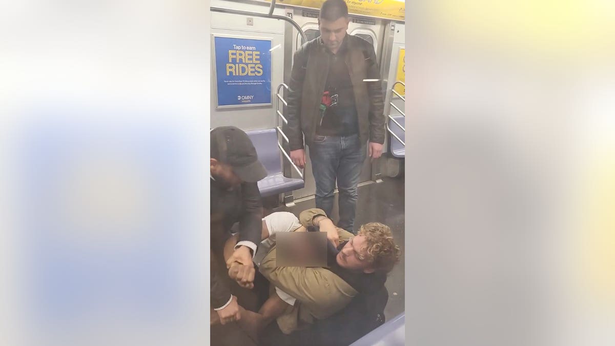 Screenshot from bystander video showing Jordan Neely being held in a chokehold on the New York City subway. As Neely struggled against the headlock, witness Eric Gonzales held Neely’s hands away. (Luces de Nueva York/Juan Alberto Vazquez via Storyful)