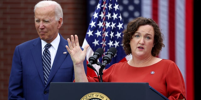 President Biden looks on as Rep. Katie Porter, D-Calif., speaks before Biden delivered remarks on lowering costs for American families at Irvine Valley College in Orange County on Oct. 14, 2022 in Irvine, California.