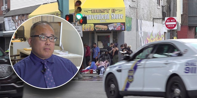 Oh, Philadelphia’s Republican mayoral candidate, criticizes the city’s inaction shutting down open-air drug dealing and consumption. He says police are just whizzing by drug users on Kensington Avenue and allowing the lawlessness to continue. (Megan Myers/Fox News Digital)