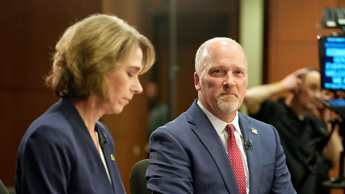 Wisconsin Supreme Court candidates Brad Schimel and Susan Crawford are seen before a televised debate on Wednesday, March 12, 2025 in Milwaukee. (AP Photo/Morry Gash)