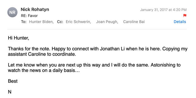 Nicolas Rohatyn told Hunter Biden on Jan. 31, 2017, that he would be ‘happy to connect’ with Jonathan Li. (Fox News)