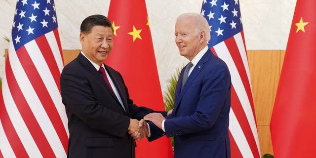 President Joe Biden shakes hands with Chinese President Xi Jinping as they meet on the sidelines of the G20 leaders’ summit in Bali, Indonesia, Nov. 14, 2022. (Reuters/Kevin Lamarque)