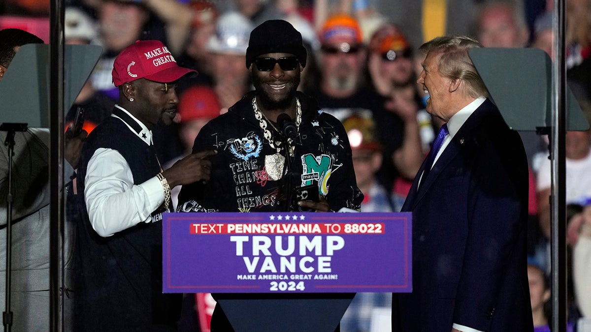 Republican presidential nominee former President Donald Trump listens to former Pittsburgh Steelers Antonio Brown, left, and, Le’Veon Bell, at a campaign rally, Saturday, Oct. 19, 2024, at Arnold Palmer Regional Airport in Latrobe, Pa. (AP Photo/Matt Rourke)