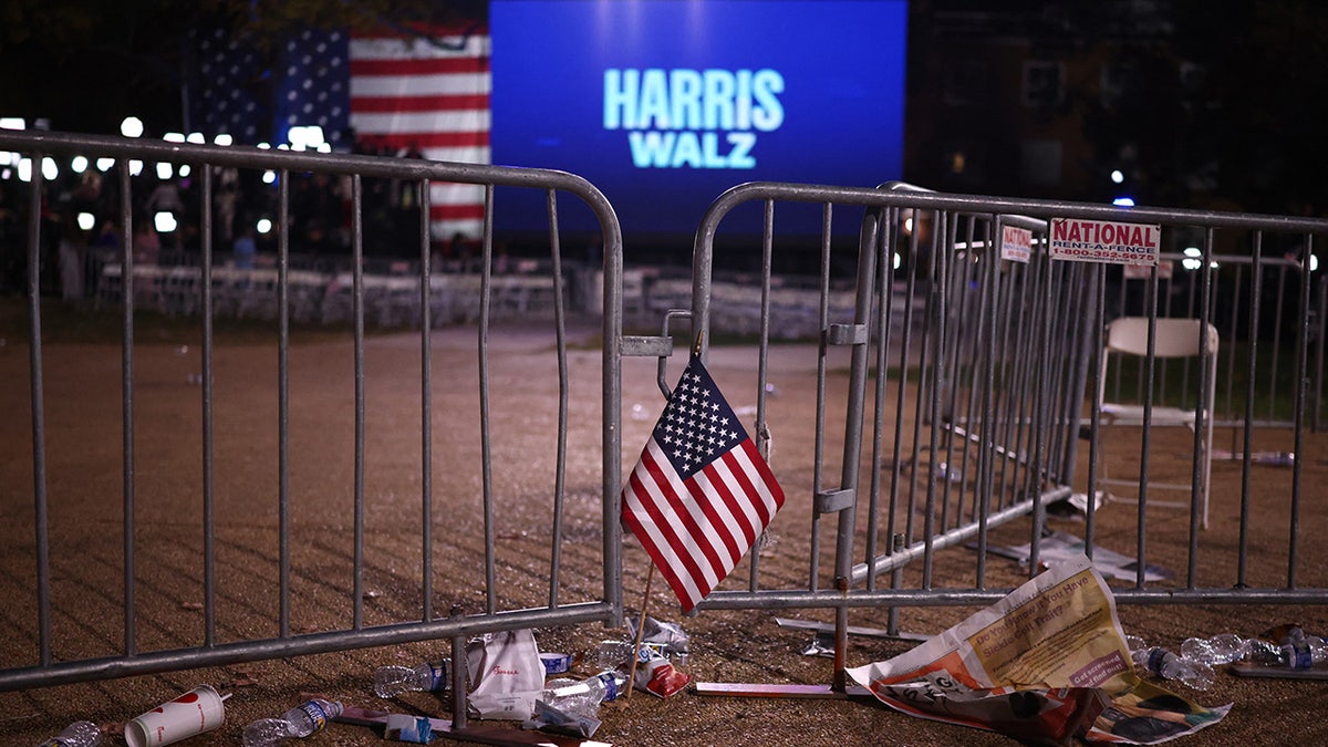 A flag is left by a barrier at the Election Night rally for Democratic presidential nominee Vice President Kamala Harris at Howard University, in Washington, D.C., Tuesday. (Daniel Cole/Reuters)