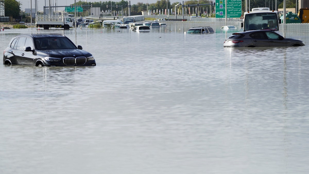 Vehicles sit abandoned in floodwaters covering a road in Dubai, United Arab Emirates, April 17, 2024. With cloud seeding, it may rain, but it doesn’t really pour or flood — at least nothing like what drenched the United Arab Emirates and paralyzed Dubai. (AP Photo/Jon Gambrell)
