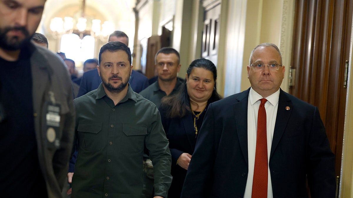 Ukrainian President Volodymyr Zelenskyy walks with Sergeant at Arms William McFarland as he leaves a meeting with members of Congress at the Capitol on Sept. 21, 2023. (Anna Moneymaker/Getty Images)