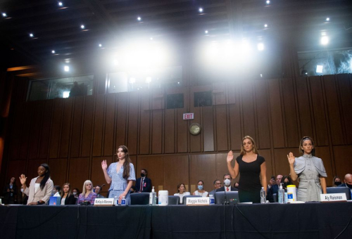 From left, Biles, McKayla Maroney, Maggie Nichols and Aly Raisman are sworn in to testify before the Senate Judiciary Committee in September 2021. They sharply criticized how FBI agents handled the sexual abuse allegations against Larry Nassar, the former USA Gymnastics team doctor now serving a long prison sentence. Saul Loeb/Pool/AFP/Getty Images