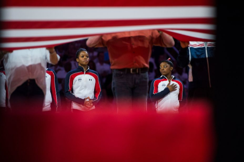 Biles, right, and fellow gymnast Gabby Douglas stand during the opening ceremony of the 2016 US Olympic Trials. Both made the team. Douglas was the Olympic all-around champion in 2012. Donald Miralle/Sports Illustrated/Getty Images