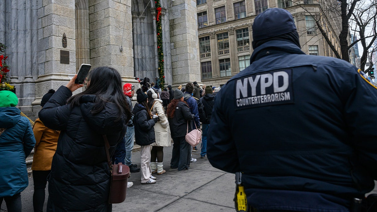 NYPD Counterterrorism officers stand outside St. Patrick’s Cathedral as visitors wait in line for mass. (Alexi J. Rosenfeld/Getty Images)