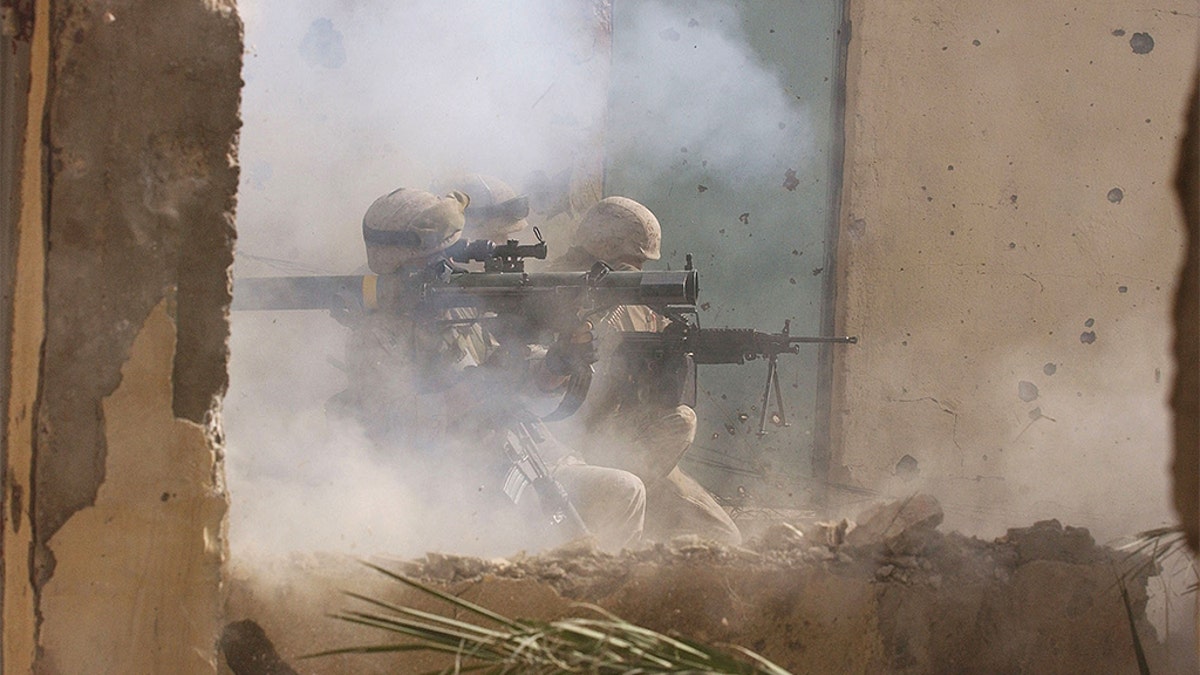 U.S. Marines of the Light Armored Reconnaissance company of the 1st Battalion, 3rd Marines, fire a rocket to clear houses at the site where four insurgents staged a bloody attack that killed one American and wounded many others, Nov. 23, 2004, in Fallujah, Iraq. (Scott Peterson/Getty Images)