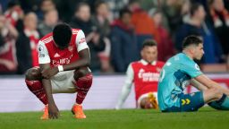 Arsenal’s Bukayo Saka, left, pauses at the end of the English Premier League soccer match between Arsenal and Southampton at Emirates stadium in London, Friday, April 21, 2023.