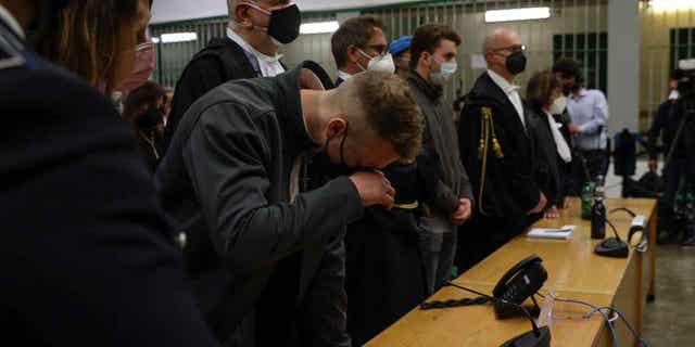 Finnegan Lee Elder wipes his eye as he and his co-defendant listen as the verdict is read, in the trial for the homicide of an Italian police officer near their hotel in Rome in 2019, on May 5, 2021. Italy’s highest court on March 15, 2023, was hearing the final appeal of two U.S. citizens. (AP Photo/Gregorio Borgia, File)