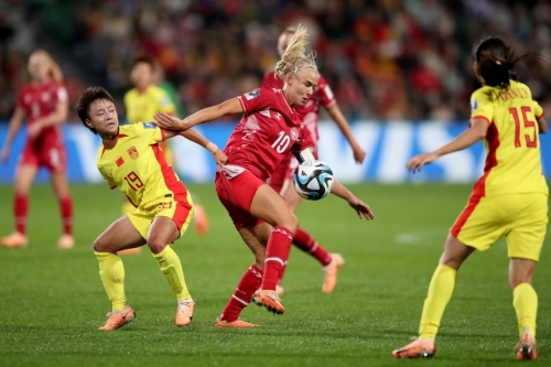 China’s Zhang Linyan competes for the ball with Denmark’s Pernille Harder.