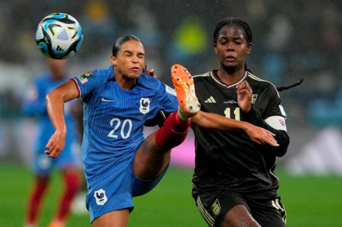 Jamaica’s Atlanta Primus tugs the shirt of France’s Grace Geyoro.