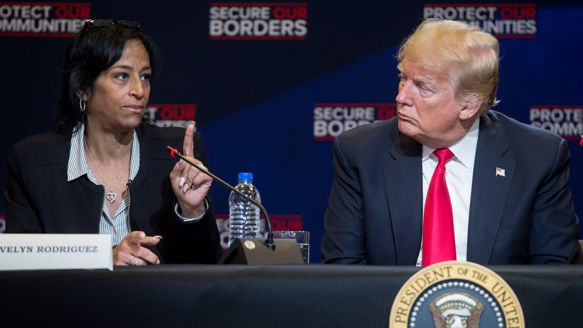President Trump speaks alongside Evelyn Rodriguez, whose daughter was killed by MS-13 gang members, during a discussion on immigration at Morrelly Homeland Security Center in Bethpage, New York, May 23, 2018. (Saul Loeb/AFP via Getty Images)