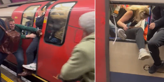 Other subway riders appear to have their bodies wedged in between the train’s doors in an attempt to flee.