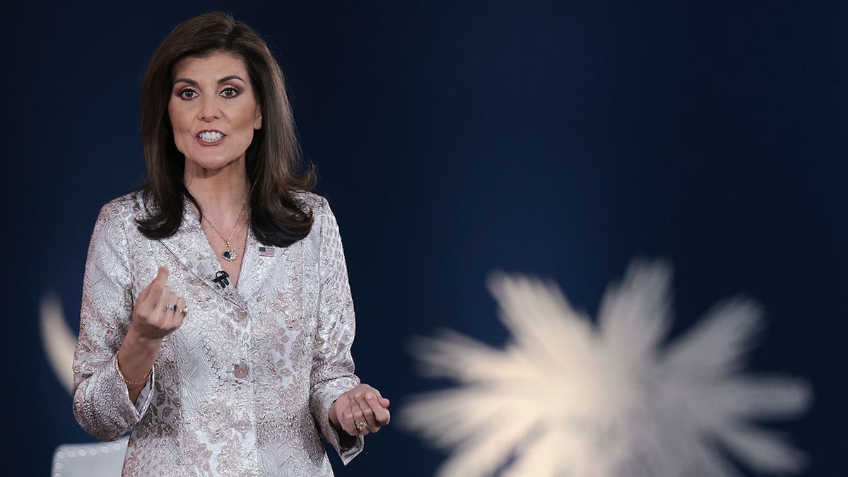 Republican presidential candidate former U.N. Ambassador Nikki Haley speaks during Fox News’ “Democracy 2024: South Carolina Town Hall” on Feb. 18 in Columbia, South Carolina, ahead of its Republican primary on Feb. 24. (Win McNamee/Getty Images)
