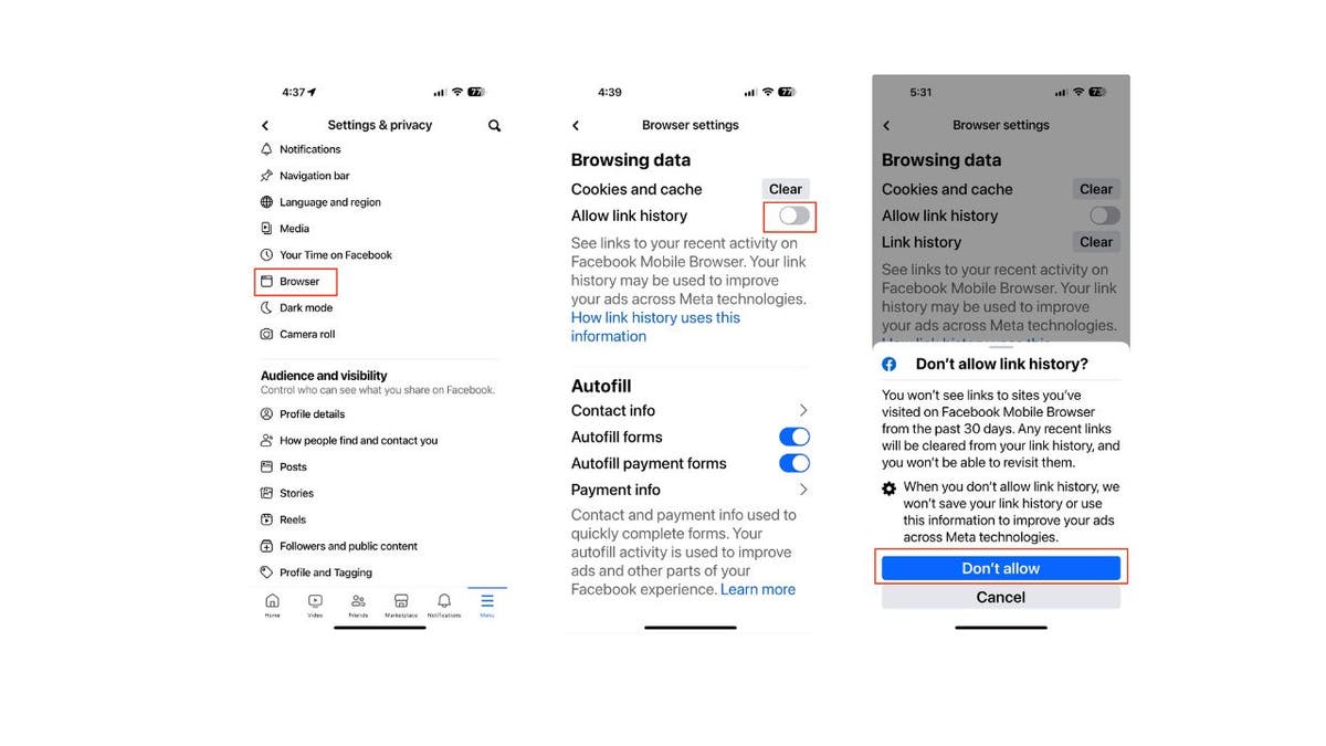 It’s important to note Link History is off by default until you choose to turn it on. You can turn this setting on or off at any time. You might want to turn on Meta’s Link History if you want to easily access the websites you’ve visited on Facebook’s Mobile Browser, and don’t mind Meta using this information to show you more relevant ads.