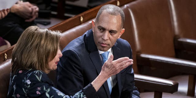 Representative Nancy Pelosi, a Democrat from California, left, speaks with Representative Hakeem Jeffries, a Democrat from New York, during a meeting of the 118th Congress in the House Chamber at the US Capitol in Washington, DC, US, on Friday, Jan. 6, 2023. (Al Drago/Bloomberg via Getty Images)