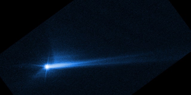 This imagery from NASA’s Hubble Space Telescope from Oct. 8, 2022, shows the debris blasted from the surface of Dimorphos 285 hours after the asteroid was intentionally impacted by NASA’s DART spacecraft on Sept. 26. (Credits: NASA/ESA/STScI/Hubble)