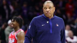 PHILADELPHIA, PENNSYLVANIA – FEBRUARY 10: Head coach Doc Rivers of the Philadelphia 76ers looks on during the fourth quarter against the New York Knicks at Wells Fargo Center on February 10, 2023 in Philadelphia, Pennsylvania. NOTE TO USER: User expressly acknowledges and agrees that, by downloading and or using this photograph, User is consenting to the terms and conditions of the Getty Images License Agreement. Tim Nwachukwu/Getty Images