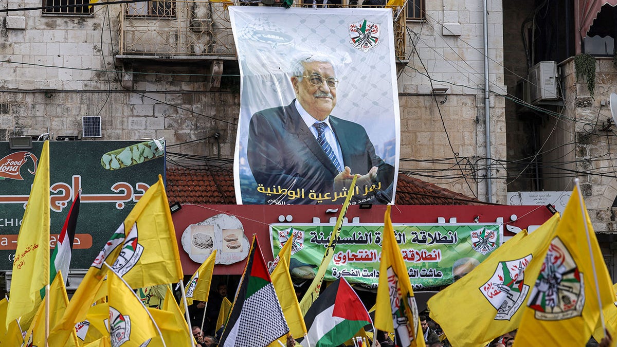 A large banner depicting Palestinian President Mahmud Abbas hangs as supporters of the Fatah movement rally ahead of the 60th anniversary of its establishment and in support of the Palestinian Authority’s security operation in the Jenin camp for Palestinian refugees on Dec. 29, 2024. (JAAFAR ASHTIYEH/AFP via Getty Images)