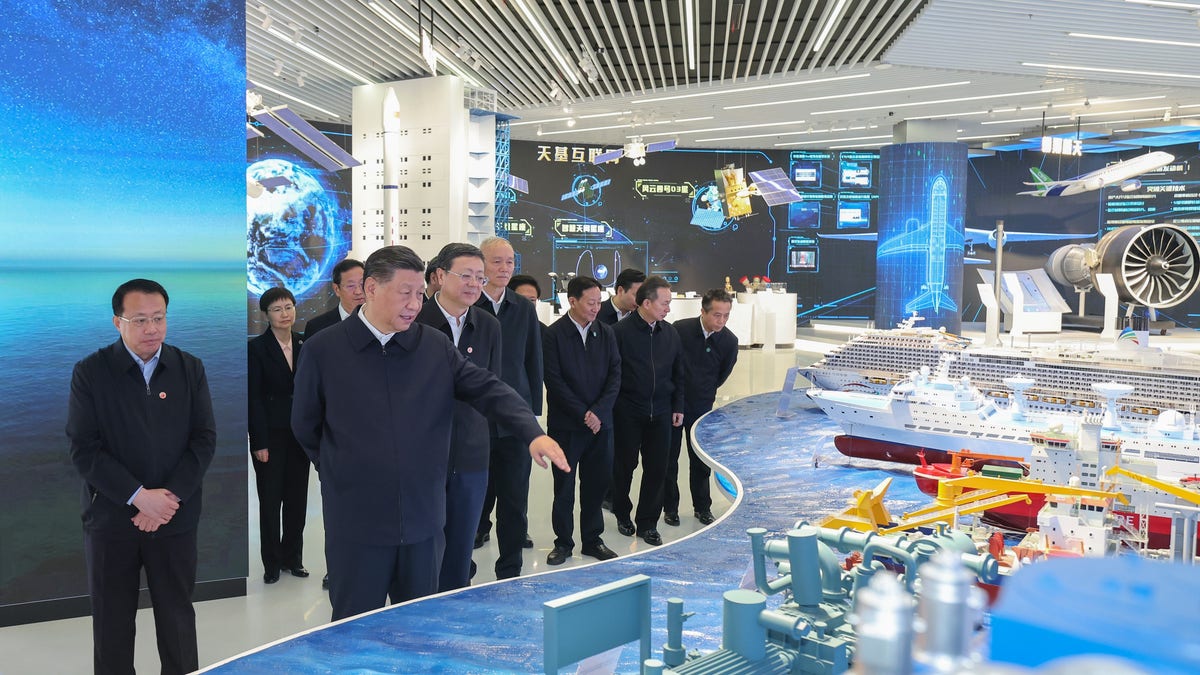 Chinese President Xi Jinping inspects an exhibition on Shanghai’s sci-tech innovations in Shanghai on Nov. 28, 2023. (Wang Ye/Xinhua via Getty Images)