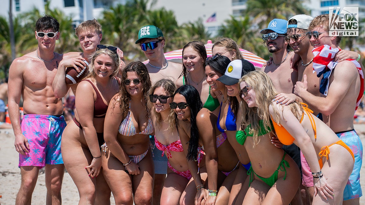 A group of spring breakers pose for a photo while enjoying Fort Lauderdale Beach on Sunday, March 24, 2024. The city saw an influx of college students after Miami Beach announced they were “breaking up with” spring break after last year’s season brought deadly chaos to the area. (Julia Bonavita/Fox News Digital)