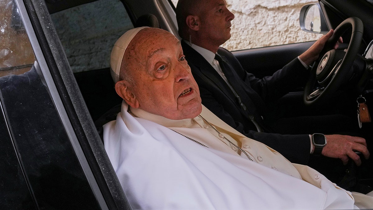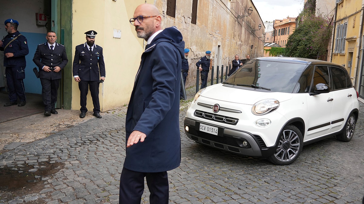 Pope Francis talks to journalists as he leaves at the end of his visit to the Regina Coeli penitentiary in Rome on Holy Thursday, April 17, 2025. (Andrew Medichini)