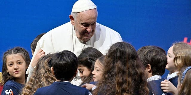 Pope Francis greets children during a two-day “General States of Birth” conference in Rome on May 12, 2023. (Photo by FILIPPO MONTEFORTE/AFP via Getty Images)