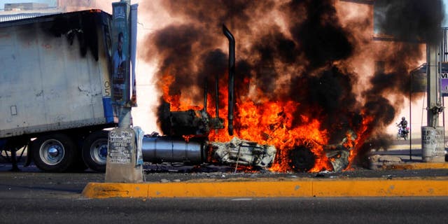 A truck burns on a street in Culiacan, Sinaloa, Mexico, on Jan. 5, 2023. Mexican security forces captured Ovidio Guzman, an alleged drug trafficker wanted by the United States and one of the sons of former Sinaloa Cartel boss Joaquin “El Chapo” Guzman, in a pre-dawn operation that set off gunfights and roadblocks across the western state’s capital. (AP Photo/Martin Urista)