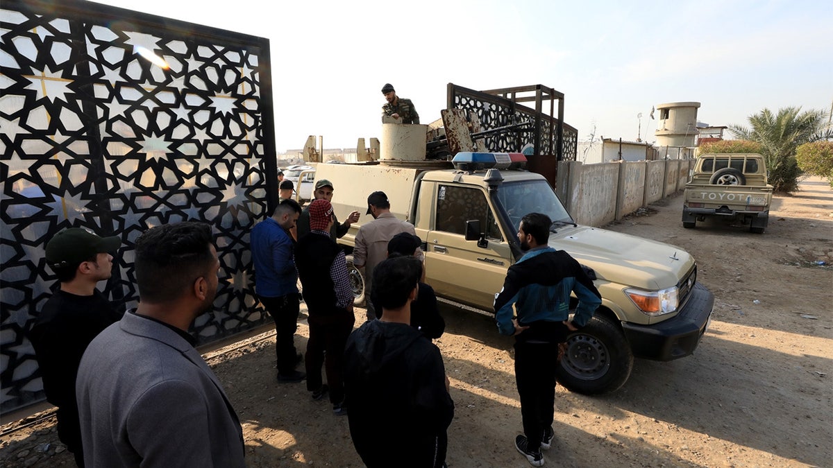 Iraqi security forces arrive to inspect the site where Al-Nujaba senior commander Abu Taqwa Al-Saidi was killed in a US drone strike, at the logistical support department of Hashd al-Shaabi in Baghdad on Jan. 4, 2024. (Photo by Murtadha Al-Sudani/Anadolu via Getty Images)