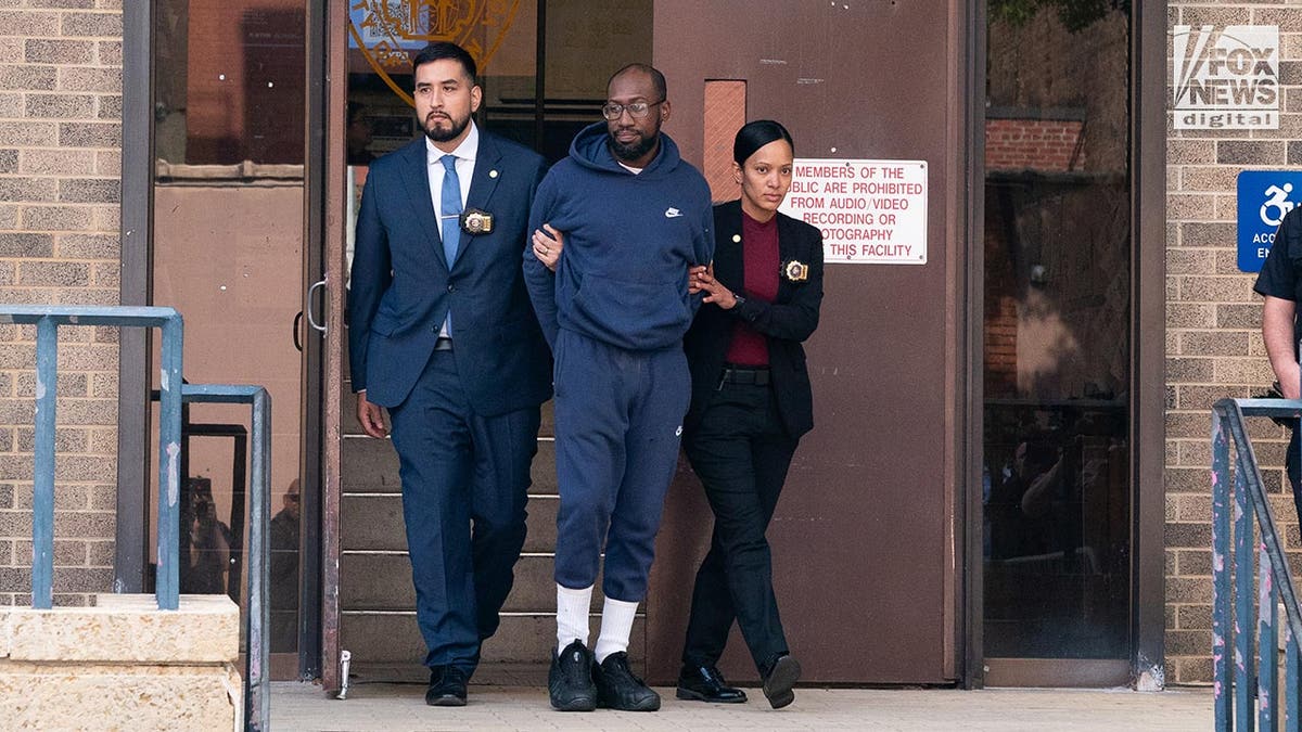 Travor Nurse, 40, is escorted from the 23rd Precinct on Oct. 7, 2024, in Manhattan, New York. Nurse is charged in relation to an alleged assault over the weekend on former New York Gov. David Paterson and his 20-year-old stepson, Anthony Sliwa. (Barry Williams for Fox News Digital)