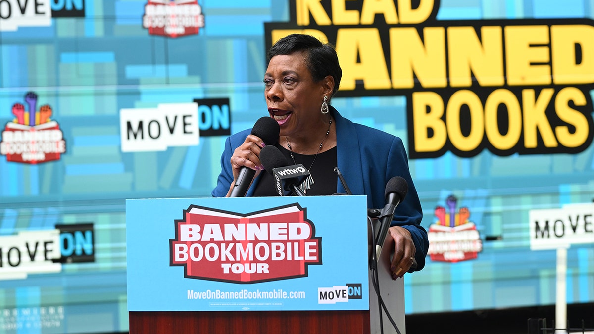 Becky Pringle, president of the National Education Association, speaks during MoveOn’s national Banned Bookmobile tour launch at Sandmeyer’s Bookstore July 13, 2023, in Chicago. (Daniel Boczarski/Getty Images for MoveOn)