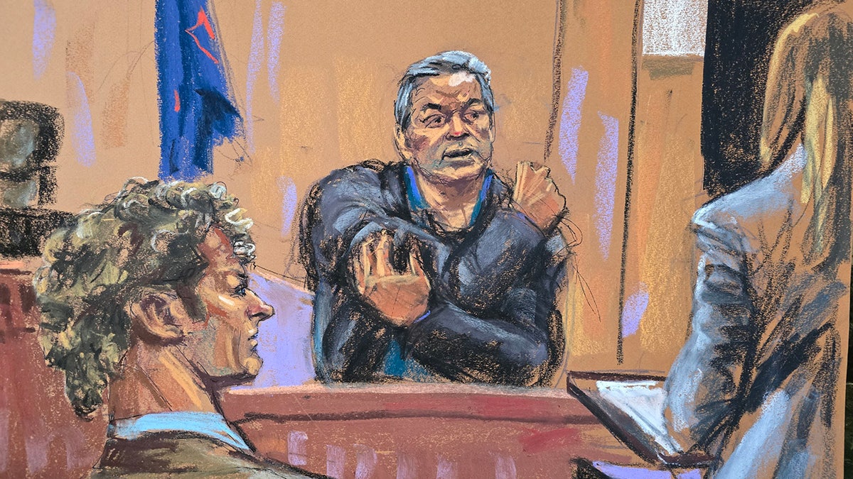 A court sketch depicts Juan Alberto Vazquez testifying on the second day of testimony in Daniel Penny’s trial at Manhattan Supreme Court in New York City on Monday, Nov. 4, 2024. Penny, a Marine veteran, is on trial for the 2023 death of Jordan Neely on the New York City subway. (Jane Rosenberg )