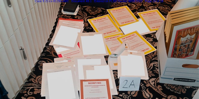 This image contained in a court filing by the Department of Justice on Aug. 30, 2022, and redacted by in part by the FBI, shows a photo of documents seized during the Aug. 8 search by the FBI of former President Trump’s Mar-a-Lago estate in Florida. On Wednesday, an appeals court lifted a judge’s ruling that blocked the Justice Department from using classified records seized.