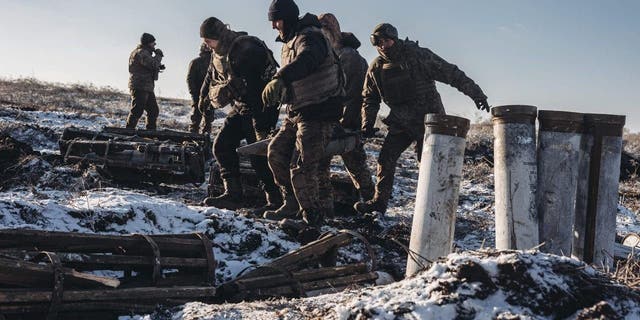 Ukrainian soldiers work with "pion" artillery in the northern direction of the Donbass frontline as Russia-Ukraine war continues in Donetsk, Ukraine on Jan. 7, 2023.