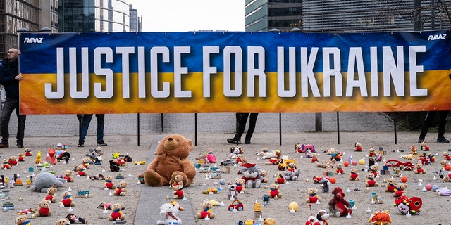 People from U.S.-based nonprofit organization avaaz light candles beside teddy bear in Schuman Roundabout, the heart of the EU district on February 24, 2023 in Brussels, Belgium. (Thierry Monasse/Getty Images)