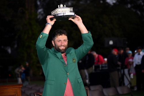Jon Rahm poses with the Masters trophy during the green jacket ceremony, after winning the Masters tournament on Sunday, April 9.
