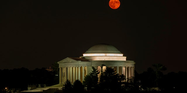 The supermoon rises above the Thomas Jefferson Memorial on the Tidal Basin in Washington, Tuesday, Aug. 1, 2023. (AP Photo/Carolyn Kaster)